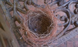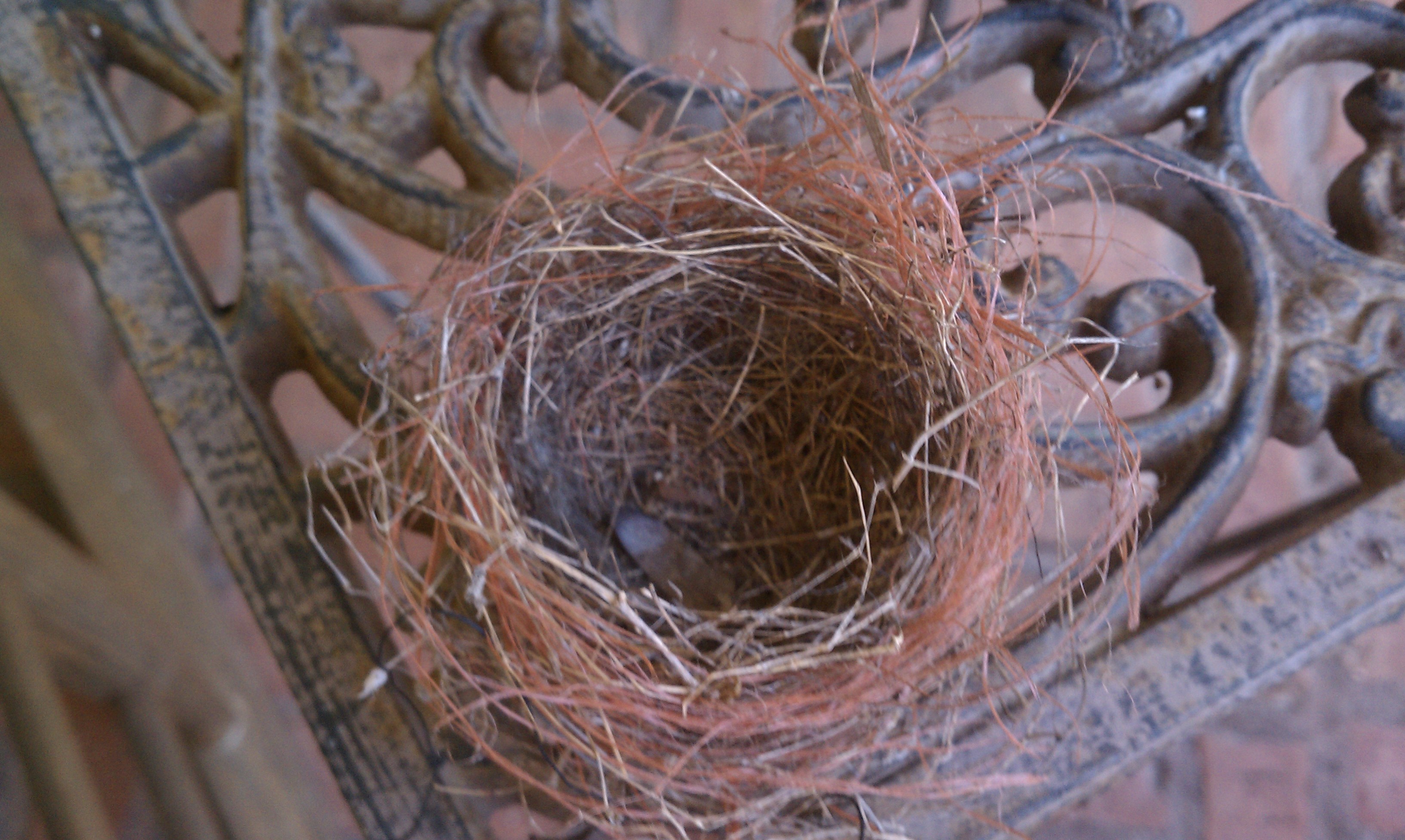 Just as I was about to knock the pine straw and leaves to the garage floor, I looked a bit closer at the mess, and there I saw it… this organized mess had a pattern to it. A deliberate pattern, as if each piece of the mess had been carefully placed. As I peered at it, I saw that this “mess” was no other than a little home to some new “neighbors” a family of birds had moved right in and made themselves comfortable on my garage shelf. This explained the sudden uptick in bird traffic I had seen recently coming and going in the garage.