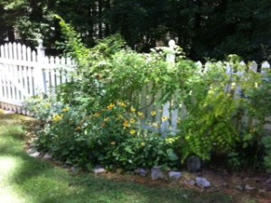 This fence looks beautiful from the back porch, all nice and white with a few plants growing along the side to enhance the look.